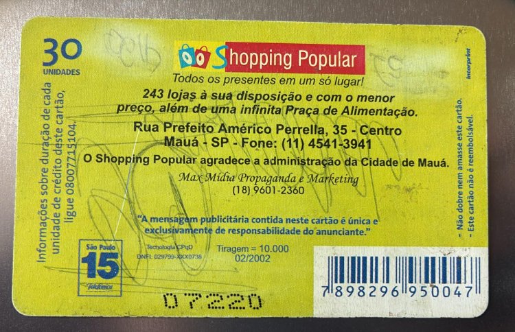 O cartão telefônico do Shopping Popular de Mauá, emitido em fevereiro de 2002, é um importante registro do cotidiano urbano e comercial da cidade no início dos anos 2000. A peça, enviada ao site Mauá Memória por Alberto GB, revela não apenas um meio de comunicação muito utilizado na época, mas também a força do comércio popular no centro do município.