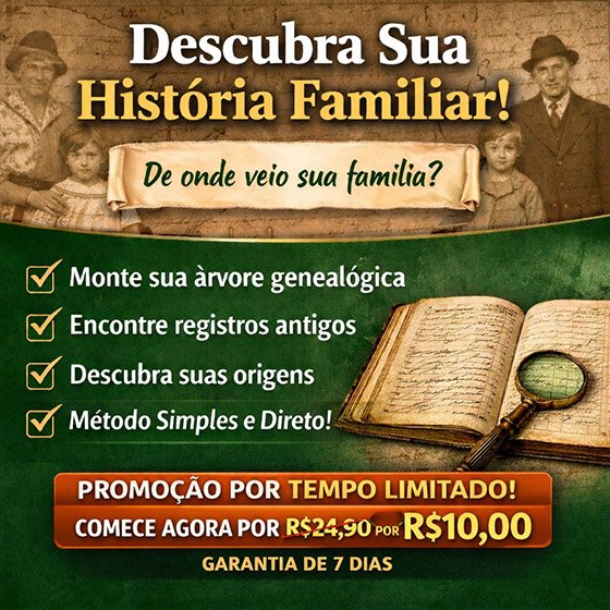 O interesse dos brasileiros em descobrir suas origens familiares tem crescido nos últimos anos. A genealogia, que estuda a história das famílias e seus antepassados, tem se tornado cada vez mais popular graças ao acesso digital a documentos e registros históricos. Para incentivar mais pessoas a iniciarem essa jornada e popularizar a pesquisa genealógica no Brasil, um ebook completo sobre História da Família está sendo vendido por apenas R$ 10,00 por tempo limitado. O material ensina de forma simples como começar a árvore genealógica, encontrar registros antigos, pesquisar sobrenomes e organizar a história da família, mesmo para quem nunca pesquisou antes.