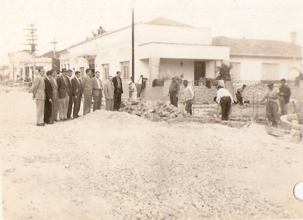 À esquerda, observa-se a presença de autoridades municipais acompanhando de perto o andamento dos trabalhos. Entre elas, está o então prefeito Élio Bernardi, figura central na administração de Mauá nos anos 1960, período marcado por crescimento urbano acelerado, melhorias viárias e organização do espaço público.